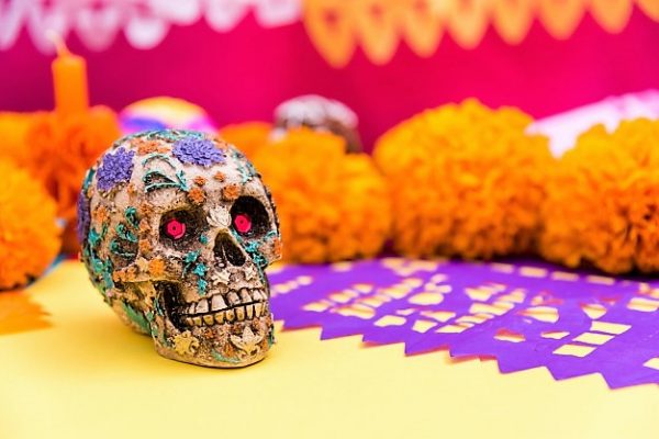 Elementos chulos y reales: papel picado, calaveritas de azúcar, velas, flores. Nada de monitos plásticos que parecen de Halloween gringo.